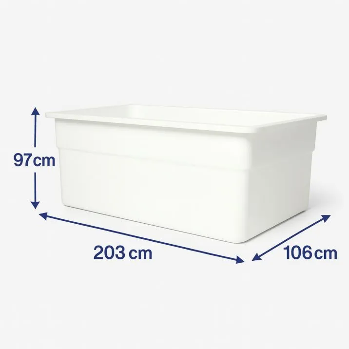 ابعاد دقیق این وان ۱۵۰۰ لیتری برابر است با طول ۲۰۳ سانتیمتر، عرض ۱۰۶ سانتیمتر و ارتفاع ۹۷ سانتیمتر؛ ابعادی که ترکیبی متعادل از حجم مفید، سطح کاربری مناسب و عمق کافی را در اختیار کاربر قرار میدهد. این طراحی بهگونهای است که میتوان از آن برای پرورش ماهی، نگهداری و ذخیره حجم قابلتوجهی از مایعات، آمادهسازی محلولها و کودهای محلول، شستوشوی تجهیزات، نگهداری موقت مواد اولیه و استفاده در خطوط تولید بهره برد. سطح داخلی نسبتاً صاف و ارتفاع منطقی مخزن، روند تخلیه و نظافت دورهای را آسان و سریع میکند.
