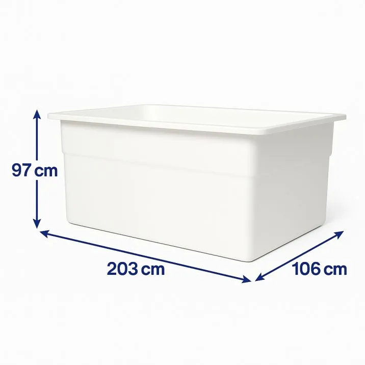 ابعاد دقیق این محصول طول ۲۰۳ سانتیمتر، عرض ۱۰۶ سانتیمتر و ارتفاع ۹۷ سانتیمتر ظرفیت واقعی و قابلاستهلاک را در اختیار کاربر قرار میدهد. این ابعاد بهگونهای طراحی شده که کارکردهای متعددی مثل پرورش ماهی و میگو، نگهداری حجم بالای مایعات، آمادهسازی محلولها، شستوشوی تجهیزات، انبارش مواد اولیه و حتی استفاده در خطوط تولید را پوشش دهد. ارتفاع مناسب و سطح داخلی صاف، تخلیه و پاکسازی دورهای را بسیار ساده میکند.