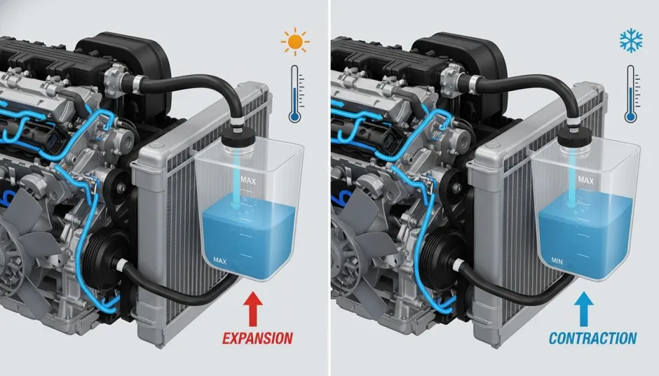 هنگامی که موتور گرم میشود، دمای مایع خنککننده بالا میرود و حجم آن افزایش مییابد. این انبساط باعث بالا رفتن فشار آب در شیلنگها، بدنه رادیاتور و بلوک موتور میشود. در چنین شرایطی، برای جلوگیری از سرریز مایع و کنترل این فشار در سطحی ایمن، سیال داغ و منبسطشده از طریق سوپاپ فشار و شلنگ سرریز وارد منبع انبساط میشود. وجود این مخزن باعث میشود مایع اضافی بهجای خروج از سیستم، در یک فضای کنترلشده ذخیره شود و سطح آب رادیاتور به شکل پایدار حفظ گردد.